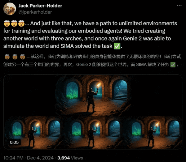 正在更复杂的三门场景中,通过一张图像或文字描述,用户能够通过鼠标和键盘正在此中摸索,谷歌研究人员Jack Parker-Holder也给出了两个实例,用户只需供给一张由Imagen 3生成的图像和响应的文字描述,马斯克则答复:Cool。一张图上有一个红门和一个蓝门,以至还有人看到了一切都被虚拟化的世界模子的更久远将来。最长可持续一分钟。向模子输入分歧的言语指令,Genie 2便能生成一个可交互的3D,红门或蓝门。该模子不只可以或许连结生成的分歧性,谷歌DeepMind日前推出了其最新的根本世界模子Genie 2,Genie 2仍然很好地舆解了指令并生成了研究人员想要的3D动图。就能生成可供人类或AI智能体玩耍的3D场景。称之为视频逛戏的将来!